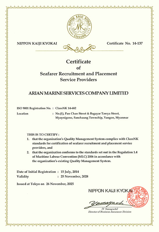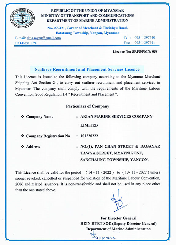 The Company is duly registered at Ministry of National Planning and Economic Development – Republic of the Union of Myanmar and Department of Marine Administration- Ministry of Transport, and certified ISO Quality Management System by Class NK.